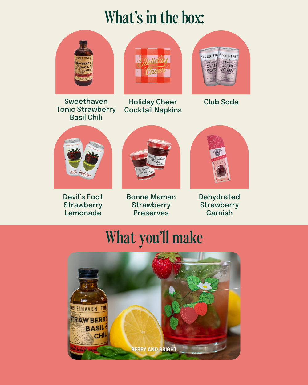 This kit features SweetHaven’s Strawberry Basil Chili mixer (trust us, it’s magic), Bonne Maman strawberry preserves for extra jammy goodness, Fever-Tree club soda, and festive holiday napkins to tie it all together. Finish your drink with dehydrated strawberry garnish, and you’ve officially unlocked your inner mixologist. We've also included two cans of the bright and bubbly Devil’s Foot Strawberry Lemonade for some extra berry goodness!