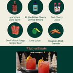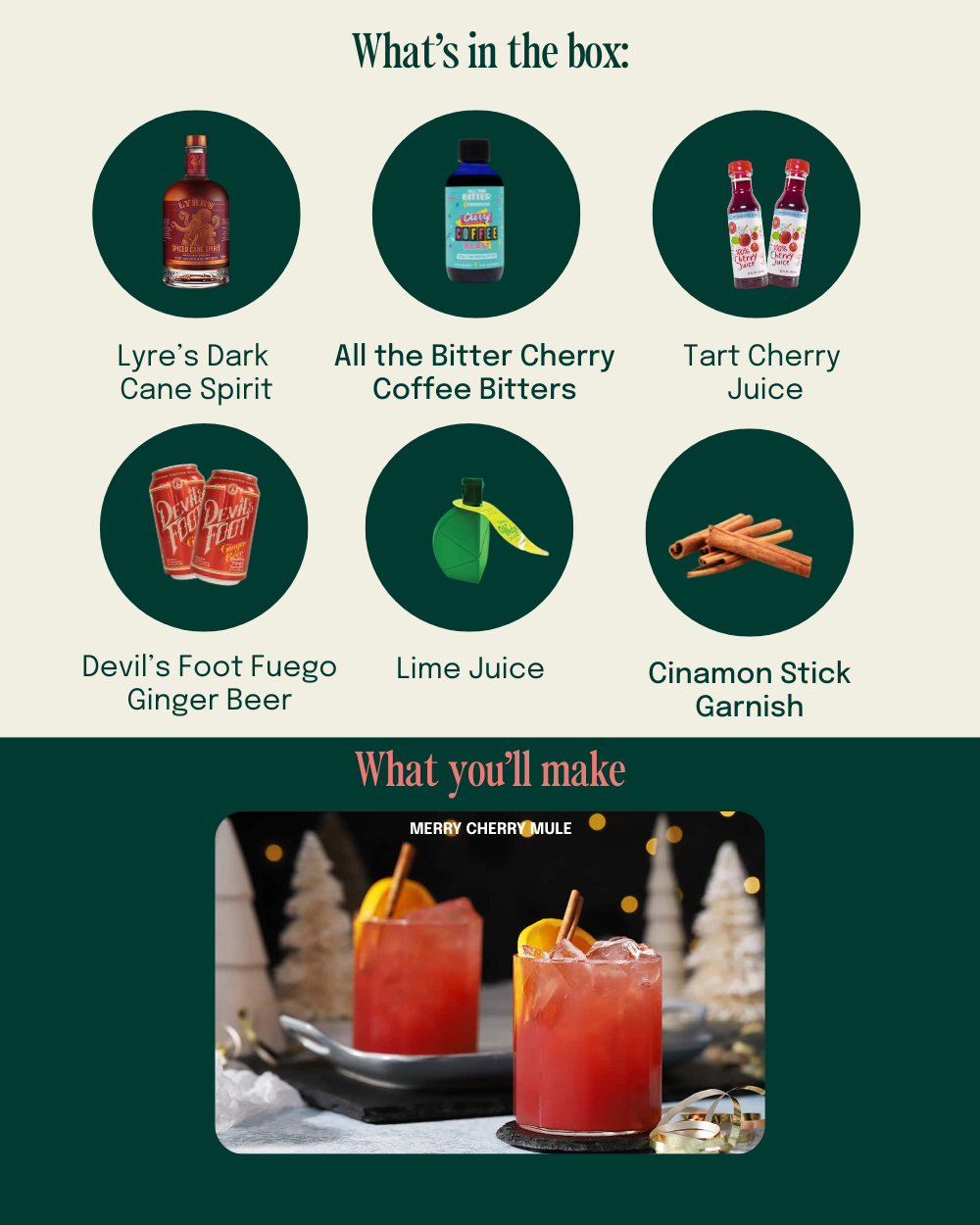 This kit features Lyre’s Dark Cane Spirit for rich depth, tart cherry juice for that juicy pop, Devil’s Foot Fuego Ginger Beer for heat and fizz, and All the Bitter’s Cherry Coffee Bitters to tie everything together with a fun, unexpected twist. Finish your drink with fresh lime and a cinnamon stick garnish, and you’ve got a holiday vibe in a glass.