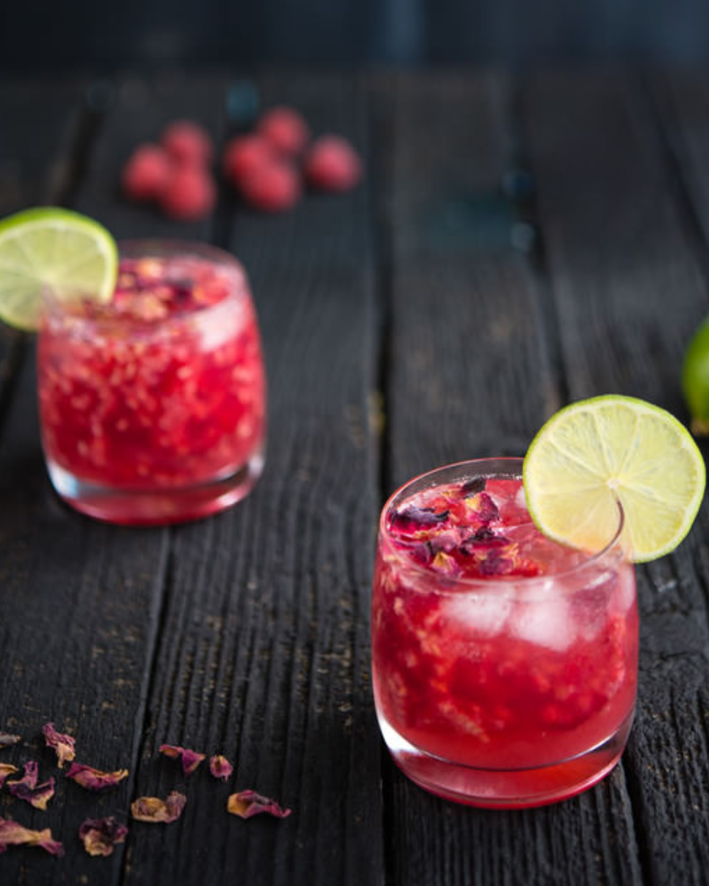 In a tumbler combine gin, rose syrup and cherry juice. Add ice and top with tonic and a squeeze of lime. Garnish with dried rose petals.