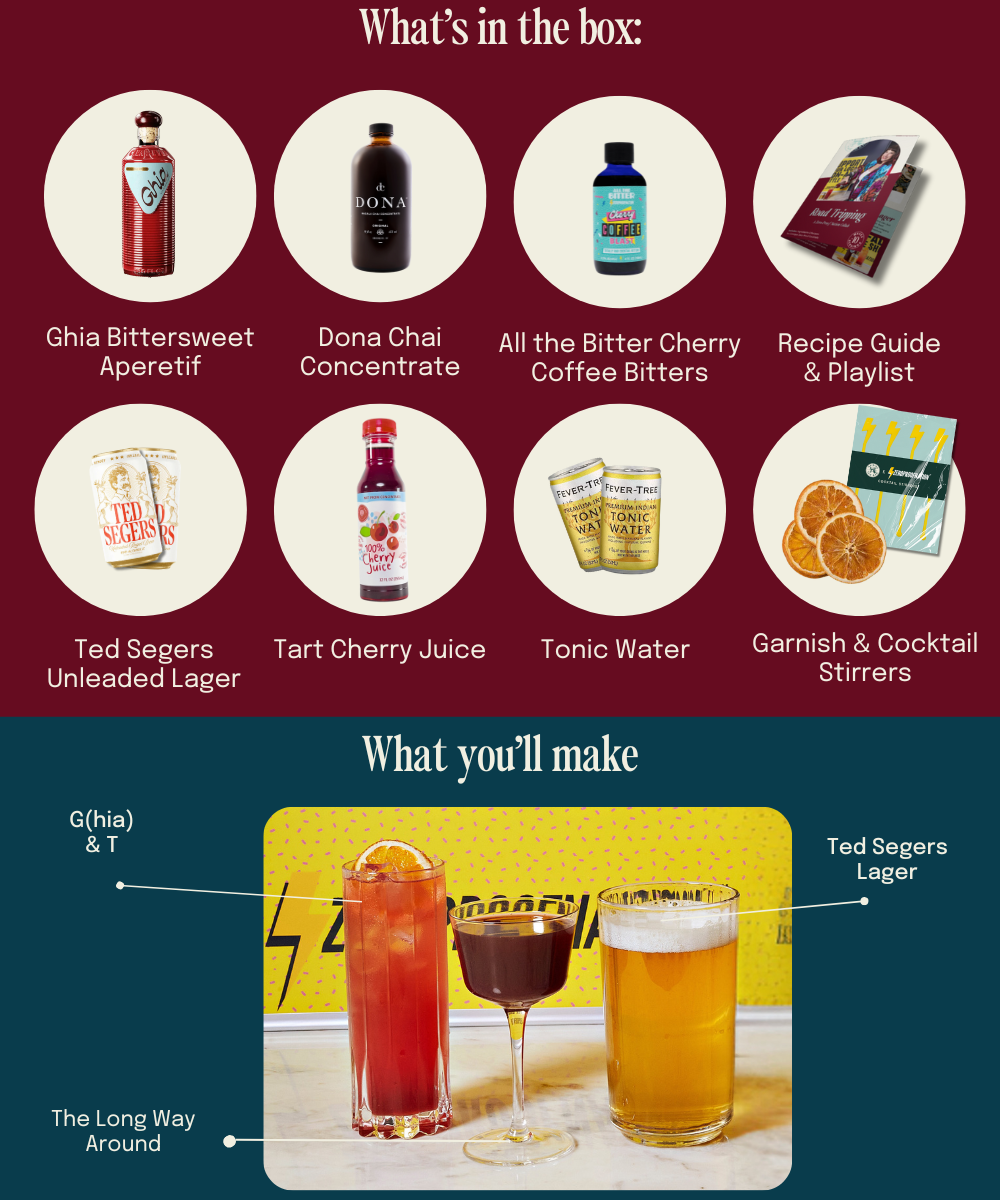We’re hitting the road with two of the biggest names in the zero-proof world—Zero Proof Nation & Ghia—to bring you a sun-soaked, soundtracked, windows-down kind of kit. Inspired by the spirit of the open road and the joy of discovery, the Road Tripping kit celebrates the standout bottle shops, makers, and flavors shaping the non-alc scene across the country.