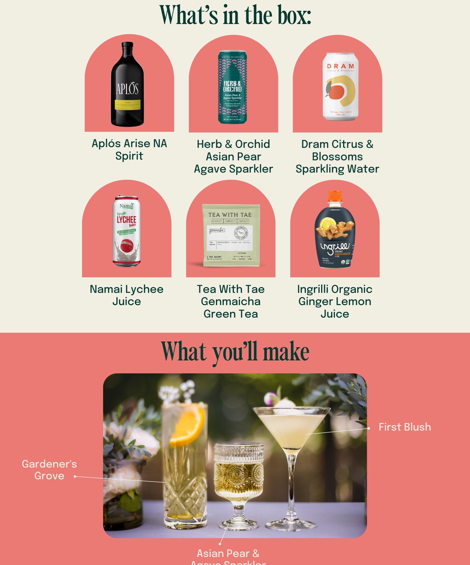 Everything you need to whip up two sophisticated sips (10+ servings) and ingredients leftover to map out your own zero-proof adventure!