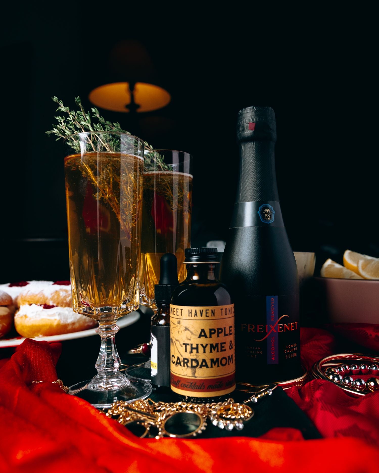 In a mixing glass filled with ice, gently stir Freixenet, Sweethaven, bitters (and sparkling water if using) to chill while preserving bubbles. Strain into a champagne flute and garnish with a sprig of thyme or a lemon peel.