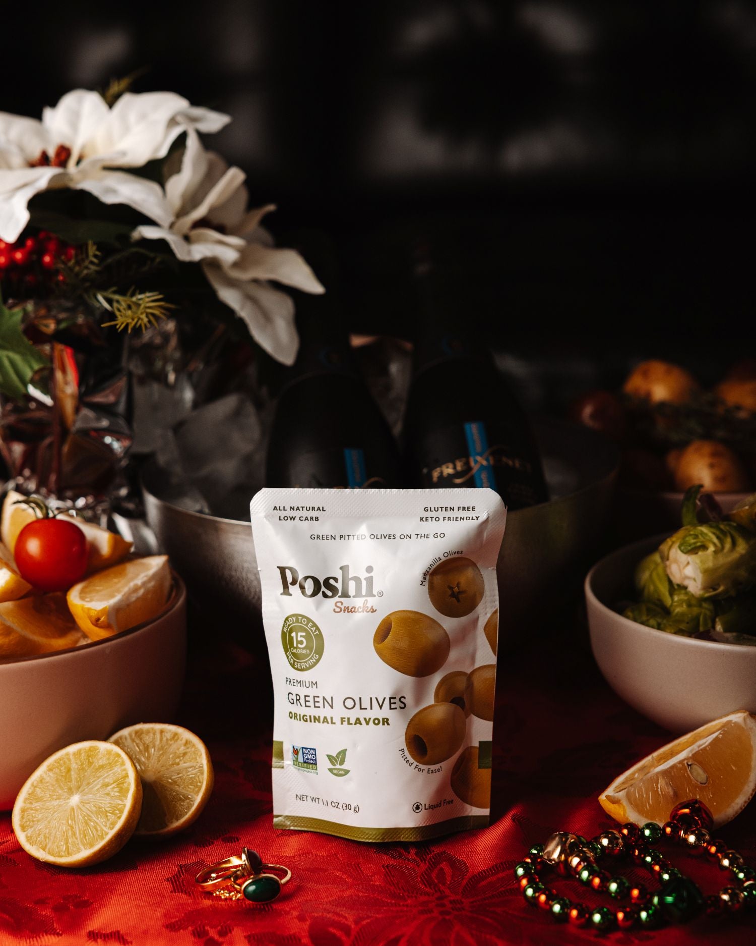 1x POSHI Green Olives - Plump, briny olives that deliver the perfect savory finish for a classic dirty martini.